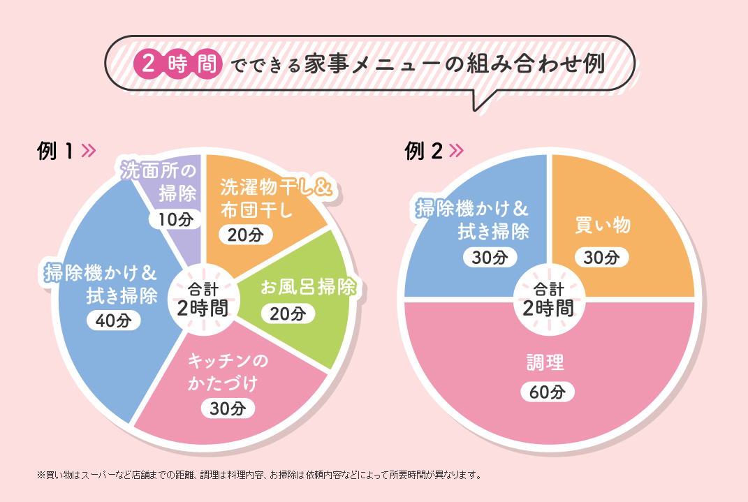 ※買い物はスーパーなど店舗までの距離、調理は料理内容、お掃除は依頼内容などによって所要時間が異なります。